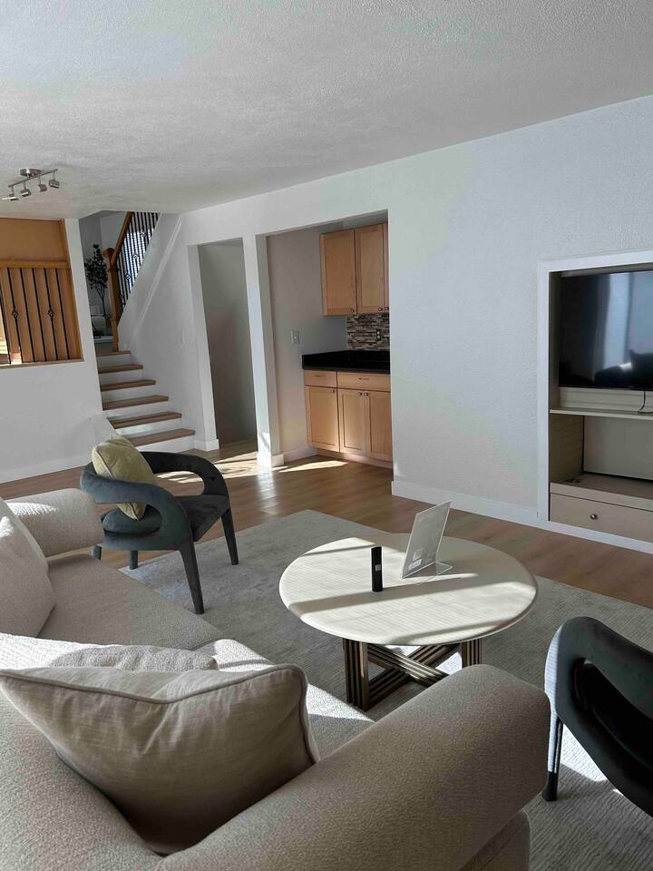 HIGHLIGHTS: ➟ 3 levels, 4 bedrooms, 2.5 bathrooms, 2404 sqft, sleeps up to 10 guests ➟ Beds: 2x King Bed, 3x Queen Beds ➟ Living Room with Smart TV ➟ Washer/Dryer in unit, detergent and dryer sheets provided. ➟ Large back yard with patio ➟ Extra-large garage available for guest to park up to 2 vehicles. HOME LAYOUT: ➟ The first floor contains the main living area, consisting a bright family room, a dining area with seating for 6, and a large kitchen and breakfast bar. On the garden level of the first floor, enjoy a spacious living room with access to our spacious back yard and patio. Upstairs, the second floor is shared between the primary bedroom with king bed and an en-suite bathroom, and two secondary bedrooms, one with king bed and another one with queen bed . A third full bathroom is in the second floor hallway. ➟ In the basement, you will find a large bedroom with two queen beds which can also serve as a work-from-home area, complete with a desk. LOCATION: Arvada is a small city located in the Denver metropolitan area of Colorado, offers small-town charm, abundant outdoor recreation opportunities, the historic district of Olde Town, a thriving cultural scene, family-friendly environment, all in close proximity to Denver.